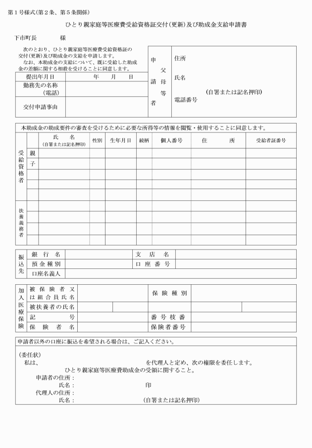 第2条 条例第5条第1項の規定による証明書の交付を受けようとする者は、ひとり親家庭等医療費受給資格証交付(更新)及び助成金支給申請書(第1号様式。以下「受給資格証交付(更新)及び助成金支給申請書」という。)に次の各号に掲げる書類を添付し、個人番号(行政手続における特定の個人を識別するための番号の利用等に関する法律(平成25年法律第27号)第2条第5項に規定する個人番号をいう。)を提供し、又は資格確認書等を添付する方法(以下「個人番号提供等」という。)により国民健康保険法又は社会保険各法の規定による被保険者等であることの確認を受けたうえ、町長に提出しなければならない。ただし、条例第2条第1号ウ又はエに掲げる者について、条例第4条第1項第1号に規定する扶養者等が同時に申請書を提出する場合には、受給資格証交付(更新)及び助成支給申請書その他の書類の提出を要しない。