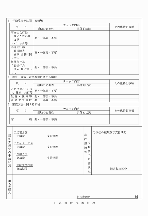 第8条 施設訓練等支援費に係る障害程度区分の変更の申請をしようとする者は、障害程度区分変更申請書(第13号様式)により下市町に申請するものとする。