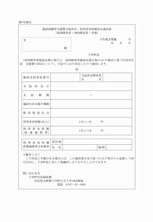 第5条 受給者証の交付を受けた者が氏名又は居住地の変更を行つた場合には、支援費受給者居住地等変更届(第9号様式)により下市町に届け出るものとする。