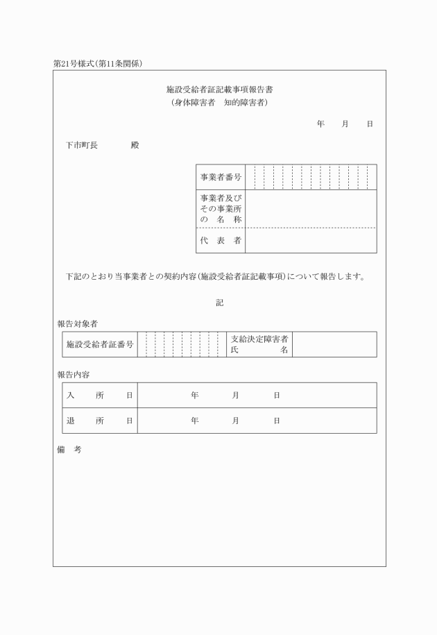 3 指定施設は、障害者の入所又は退所に際しては、施設受給者証記載事項報告書(第21号様式)により下市町に遅滞なく報告するものとする。