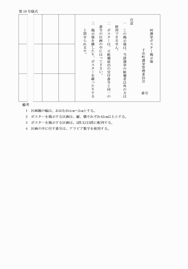 第26条 委員会は、下市町議会議員及び下市町長の選挙におけるポスター掲示場の設置に関する条例(昭和61年10月下市町条例第18号。)第2条の規定によるポスター掲示場(以下「掲示場」という。)を第19号様式に準じて設置するものとする。