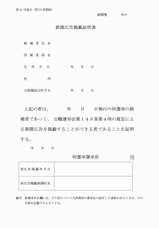 第32条 選挙長は、法第149条第4項の規定による新聞広告をするために必要な新聞広告掲載証明書(第21号様式)を、候補者1人につき2枚交付しなければならない。